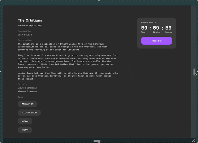 endsIn 영역(타이머)이 description까지 늘어나게 되는데, 이는 해당 요소에 height를 지정하지 않아 왼쪽 컨텐츠의 높이값을 따라가기 때문이다. 이 문제를 해결하기 위해 endsIn 컨텐츠에 min-content 값을 적용하여 자신의 내용물 크기만큼만 높이를 가지도록 했다.